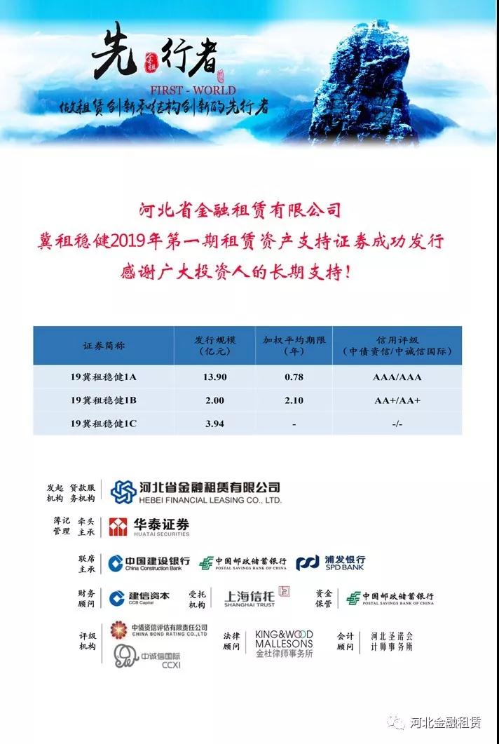 日前,河北省金融租賃有限公司(以下簡(jiǎn)稱“河北金租”)冀租穩(wěn)健2019年第一期租賃資產(chǎn)支持證券在銀行間債券市場(chǎng)成功簿記建檔發(fā)行,合計(jì)金額19.84億元。