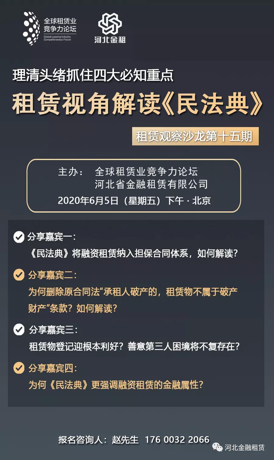 6月5日下午,全球租賃業(yè)競(jìng)爭(zhēng)力論壇與河北省金融租賃有限公司將在北京聯(lián)合主辦“租賃視角解讀《民法典》”研討會(huì),本次研討會(huì)邀請(qǐng)了融資租賃專業(yè)法庭法官,金融租賃公司、融資租賃公司法務(wù)總監(jiān),律師事務(wù)所主任律師等資深業(yè)內(nèi)人士參會(huì),共同研討和分享《民法典》實(shí)施后對(duì)融資租賃的經(jīng)營(yíng)影響,租賃公司如何做好準(zhǔn)備主動(dòng)應(yīng)對(duì)等主題,
